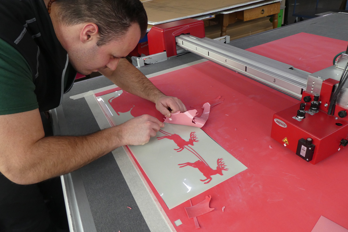 Der neue Plotter ermöglicht besonders feine Details bei Lackformen, wie sich an der Form der für unseren Weihnachts-Newsletter geplotteten Rentiere erkennen lässt. Unser Weihnachtsmotiv wurde übrigens aus der besonders einfach zu strippenden Qualität Rossa Evo von TyreF geschnitten.